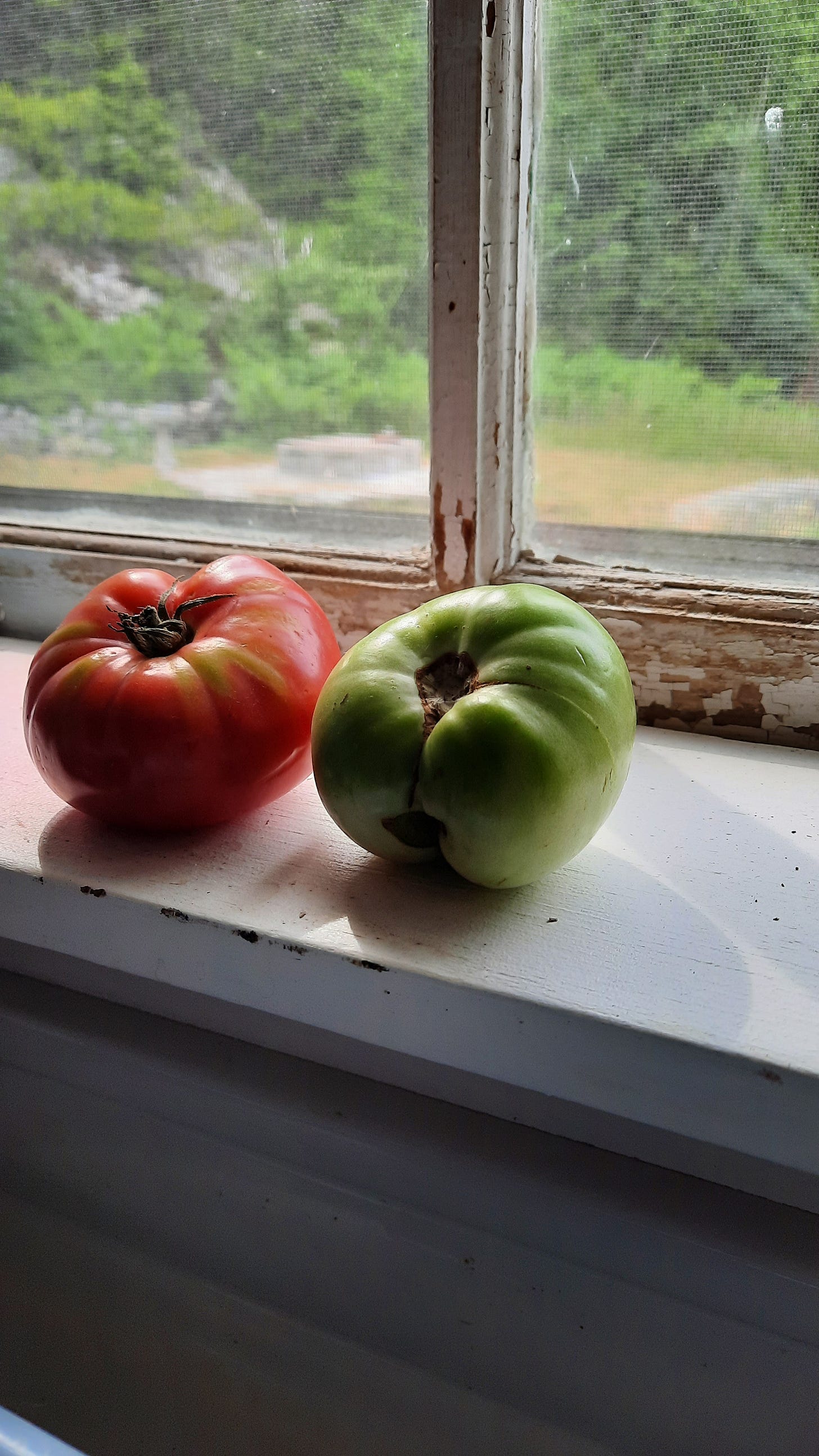 Two tomatoes on a Maine window sill, Paint-chipped, back-lit with morning filtered Through firs huddled on a low coastal hill, Makes me think for a moment that this Is all I need to be happy and still, That this is what it takes to slow down. But I remember E.B. White lived here— To get away from New York, hustling— And could never stop seeing what is wrong With people who delight to be cruel, Even seeing more and more what was right With animals, vegetables, the world On its axis whirling through the cold dark, With radiant nurture for all its kin.